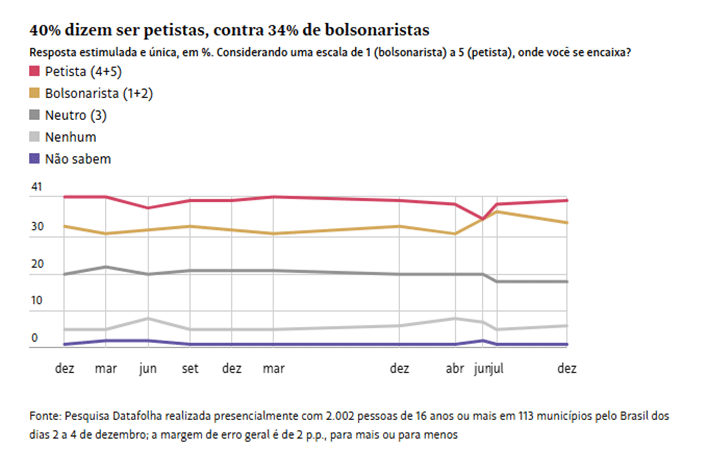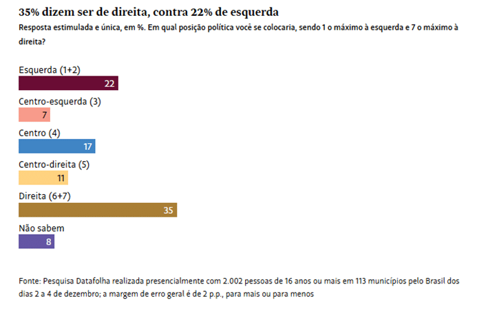 O levantamento Datafolha aponta 40% de brasileiros mais alinhados ao partido de Lula e 34%, ao de Bolsonaro. Apesar de predomínio petista em escala, 35% se dizem de direita e 22% de esquerdo, sugerindo um primeiro conflito ou confusão.