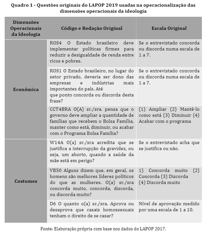 Nas palavras do autor “para aqueles que se autolocalizaram na esquerda isso significa que alguém que fosse (1) favorável à propriedade estatal, (2) favorável à expansão ou pelo menos manutenção da quantidade de famílias beneficiárias do programa Bolsa Família e que (3) concordasse que o Estado brasileiro devesse implementar políticas firmes para reduzir a desigualdade de renda, foi atribuído o score mais alto na nossa variável de “estruturação ideológica do sistema de crenças”.